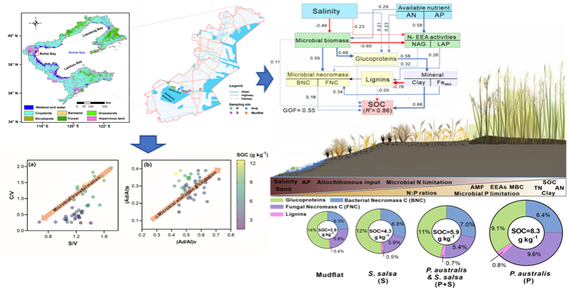 新兴研究表明土壤微生物将植物衍生的碳转化为独特的细胞组分,其残体最后会与土壤中的矿物发生相互作用,进而形成稳定的有机质。有研究使用氨基糖和木质素作为微生物源和植物来源有机碳的生物标志物,借助气相色谱-质谱联用仪,分析了盐度梯度下的土壤/沉积物样品,揭示了不同有机碳组分在滨海湿地土壤中的积累特性和影响因素。