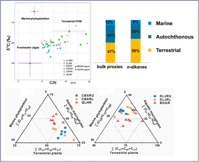 生物标志物是指环境和地质体中主要由碳、氢等元素组成的有机化合物,能够为有机碳来源提供更加细致和准确的特征信息。正构烷烃作为最丰富、最常见的类脂生物标志物之一,与依据其碳链分布特征衍生的一系列分子指标在有机碳来源示踪中发挥着重要作用。有研究利用气相色谱-质谱联用仪成功建立了正构烷烃的测定方法,并借助正构烷烃、碳氮比和稳定碳同位素共同揭示了天津滨海湿地沉积物有机碳的分布特征和不同来源(陆源、本地源和海源)有机碳对沉积物有机碳的相对贡献,对深入解析天津滨海湿地碳循环过程和碳储存具有重要意义。