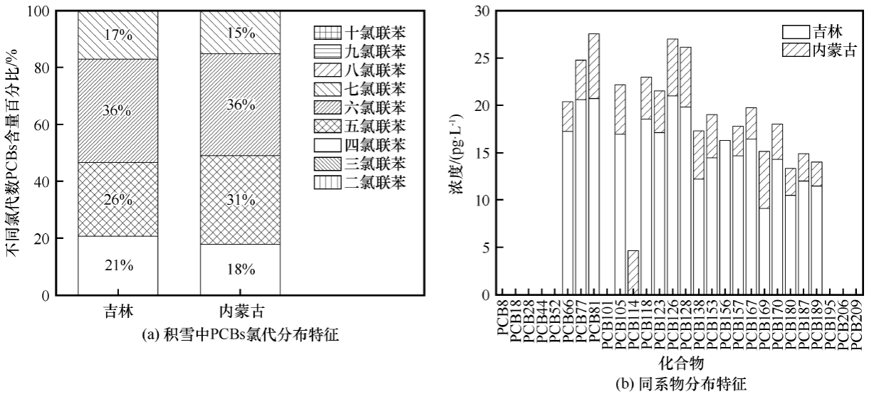 多氯联苯(PCBs)是一类典型持久性有机污染物(POPs),在环境中长期存留并通过多种环境介质进行远距离迁移,对环境安全及人类健康具有严重危害。已有研究表明PCBs在大气中广泛存在,但 在积雪中PCBs的浓度极低,大量积雪样品采集给分析研究带来困难。为了探究积雪中PCBs的含量及分布特征,本研究建立了基于气相色谱-四极杆串联飞行时间质谱(GC-QTOF/MS)测定积雪中28 种PCBs的方法,通过对我国东北典型地区积雪中PCBs的分析发现,积雪中PCBs以五、六氯联苯为主要组成,含量较高的PCB单体为PCB81、128、 126及169,结合已有研究初步推断积雪中PCBs的污染除与PCB历史生产、残留有关外,还与燃烧与热工业过程等有关。