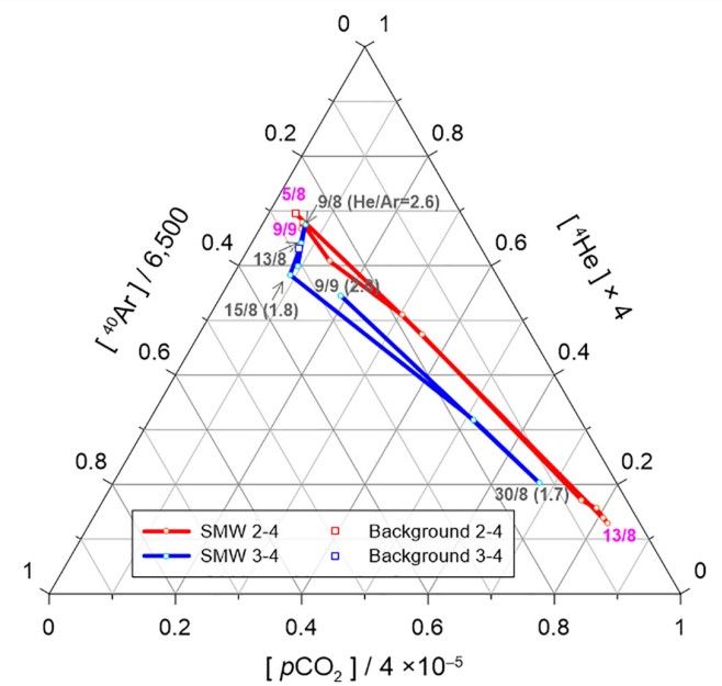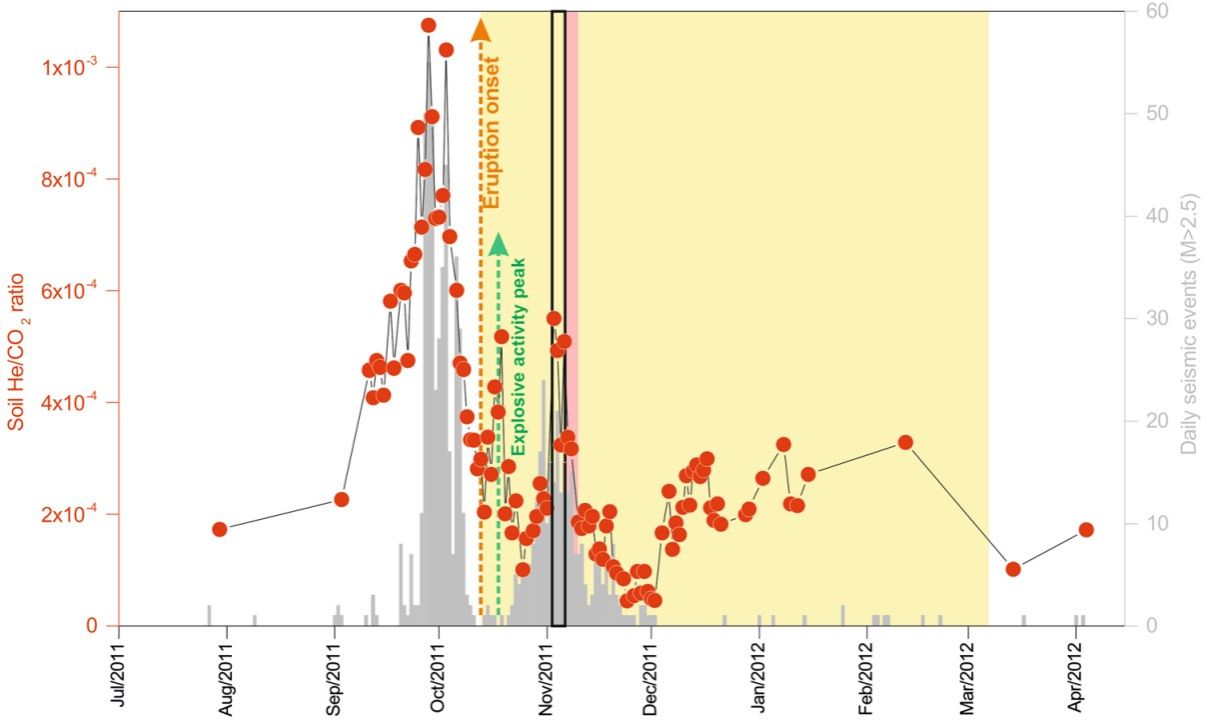 参考文献:Pérez et al., 2024, Volcanic soil gas 4He/CO2 ratio: a useful geochemical tool for real-time eruption forecasting. Scientific Reports 14: 7985 (https://doi.org/10.1038/s41598-024-57666-y).