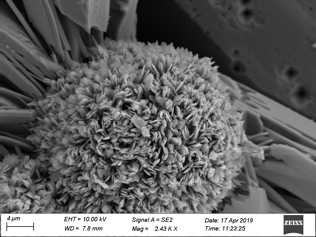 ——扫描电镜拍摄细菌的样貌和形态(左)和实验室合成矿物自发团聚成球状(右)
