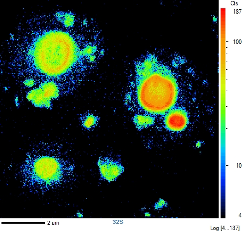 ——纳米二次离子探针拍摄黄铁矿砷元素扫描图像(左)和气溶胶颗粒扫描图像(右)